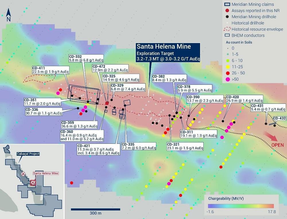 Auf dem Cu-Au-Ag- und Zn-Projekt Santa Helena ("Santa Helena") liegen nach der Wiederaufnahme des Bohrprogramms erste Ergebnisse vor, wobei CD-472 einen starken Abschnitt von 5,0 m @ 4,0 g/t AuEq aus 24,1 m ergab ("Abbildung 1"). Meridian leitet derzeit die Umweltverträglichkeitsstudien für die Erschließung im Tagebau bei Santa Helena ein, die Teil der Erschließungsstrategie für den breiteren Gürtel sind. Das Unternehmen berichtet auch, dass die metallurgischen Testarbeiten bei Santa Helena in Kürze beginnen und sich auf die Entwicklung eines Flussdiagramms zur Optimierung der Produktion von reinem Kupfer- und Gold-Silber-Konzentrat, Gold-Doré und Zinkkonzentraten konzentrieren werden. Die Bohrungen werden fortgesetzt und weitere Ergebnisse stehen noch aus.