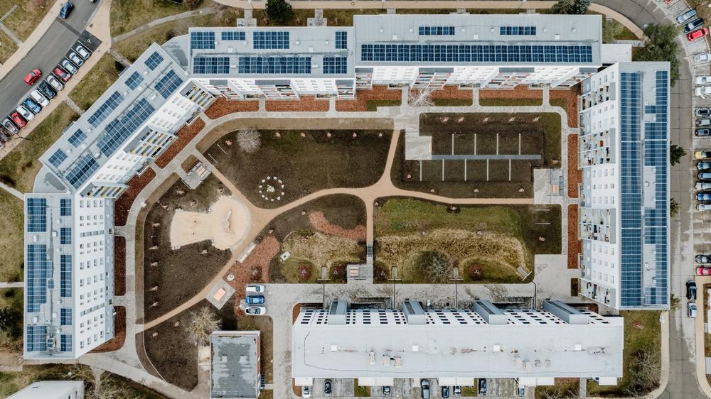 Ziel des Klimagartens war die Schaffung eines lebendigen Hofs, der generationenübergreifende Angebote, Erholung, Begegnung aber auch Mitbestimmung bietet. Und der auf die sich verändernde Klimaerwärmung reagiert. Neben Öko-Ring bedeutete das: überdachte Treffpunkte, Grill- und Spielplätze, Volleyballfeld und Mietergärten. Zur kostenlosen Bewässerung letzterer wurde ein alter Brunnen aus DDR-Zeiten aktiviert. Das Konzept wird nun zum Standard für nächste Bestandsprojekte.