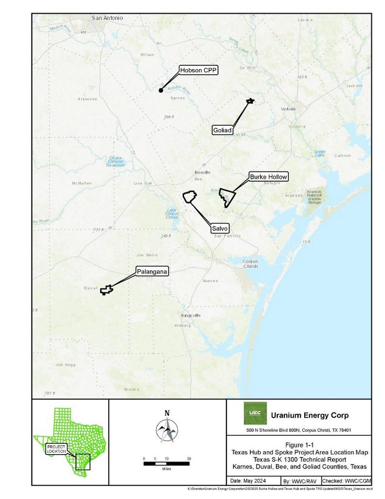 Die Plattform besteht aus fünf Projektgebieten ("Abbildung 1-1"): der Hobson Central Processing Plant ("CPP") und den Projekten Burke Hollow, Goliad, Palangana und Salvo, die sich in den Countys Karnes, Bee, Goliad und Duval in Texas befinden. Die Hobson CPP wird als "Knotenpunkt" der Plattform dienen, während die anderen Projektgebiete als Satellitenanlagen oder "Speichen" fungieren. Die Hobson CPP wird das gesamte in den anderen Projektgebieten gewonnene Uran verarbeiten. Die Texas-Plattform liegt in der South Texas Uranium Province ("STUP"), die Teil der Küstenebene des Golf von Mexiko Beckens ("GMB") ist.