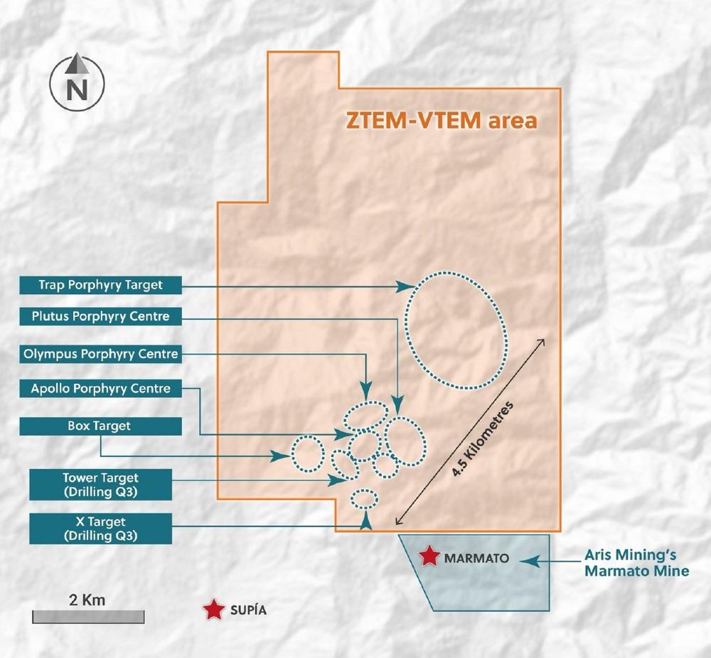 Ari Sussman, Executive Chairman, kommentierte: "Das enorme Potenzial unseres Guayabales-Projekts wurde bereits durch eine Reihe von Entdeckungen bewiesen, die wir durch Bohrungen innerhalb der Grenzen von Gebieten gemacht haben, die durch begrenzte Aufschlüsse definiert sind. Da mehr als 90 % des Projekts noch unterirdisch liegen, ist die Durchführung einer luftgestützten VTEM- und ZTEM-Untersuchung sehr sinnvoll, um uns bei der Erkundung neuer Ziele in Gebieten ohne Aufschlüsse zu unterstützen. Insbesondere freuen wir uns darauf, die Ergebnisse zu verwenden, um die geplanten zukünftigen Bohrungen auf dem Ziel Plutus zu verfeinern, da dieses Gebiet sehr groß ist und es keine auffälligen Gesteinsproben gibt."