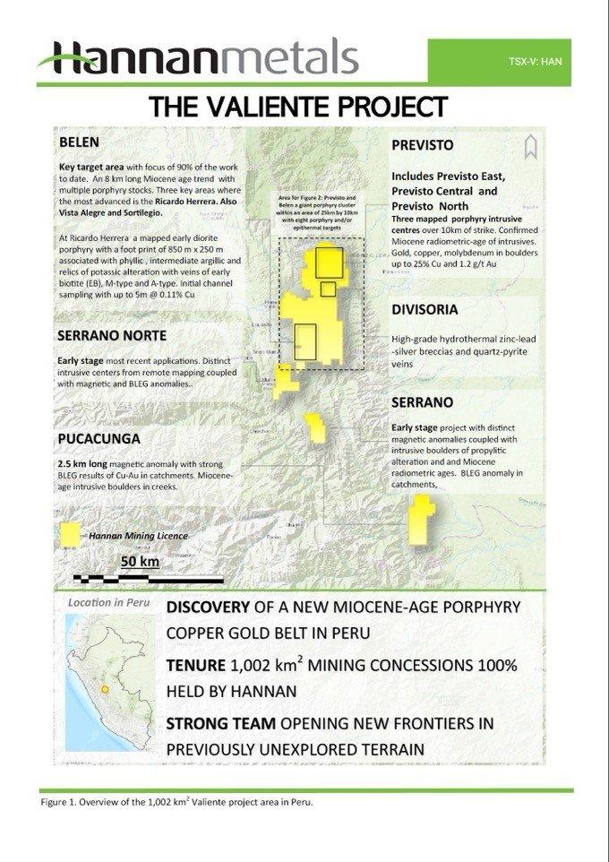 Im Jahr 2021 steckte Hannan 1.002 km2 an Bergbaukonzessionen bei Valiente ab, die sich zu 100 % in seinem Besitz befinden und unerforschtes Terrain für potenzielle mineralisierte Porphyrziele im zentralen Osten Perus abdecken. Frühe Schürfungen an der Oberfläche entdeckten zwei auffällige Kupfer-Gold-Porphyr-Ziele und ein epithermales Ziel bei Belen (siehe Pressemitteilung vom 16. Februar 2023), das nun für Bohrungen freigegeben wird (Abbildungen 1 und 2). Porphyr-Entdeckungen folgten rasch bei Serrano Norte, Serrano und Pucacunga. In jüngster Zeit lag der Schwerpunkt auf Previsto. Bei Previsto und Belen, einem Porphyr-Cluster auf Distriktbasis in einem Gebiet von 25 km mal 10 km, wurden acht porphyrische und/oder epithermale Ziele genauer identifiziert, wobei bis zu 10 Ziele in einem früheren Stadium auf weitere Arbeiten warten.