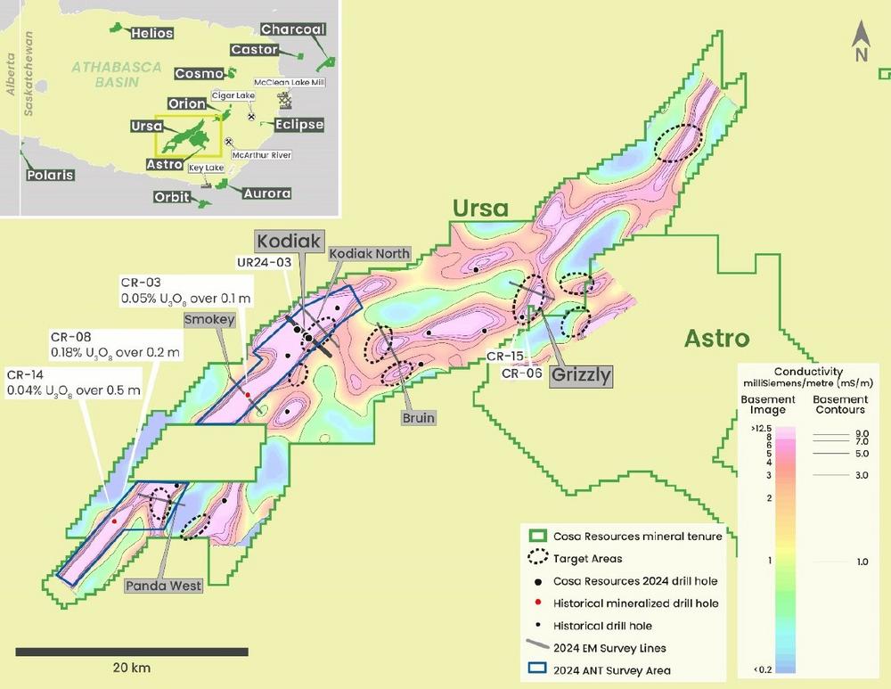 Keith Bodnarchuk, President und CEO, kommentierte: "Wir sind von der Stärke der Ziele dieses Programms sehr begeistert. In den vergangenen 12 Monaten hat das Team Ursa von einem sehr aussichtsreichen und stark unterexplorierten Projekt zu einem Projekt weiterentwickelt, das durch moderne geophysikalische Methoden strategisch vorangebracht wurde und nun für gezieltere Bohrtests bereit ist. Unsere Bemühungen haben zu 10 wichtigen Zielgebieten geführt, einschließlich der ersten Folgebohrziele bei Kodiak und Grizzly. Wir sind von der Erkundungsphase zur Fokussierung auf Gebiete übergegangen, die Schlüsselkomponenten für Uranentdeckungen aufweisen. Die Identifizierung mehrerer geologisch abgeleiteter Bohrziele zu einem frühen Zeitpunkt in Cosas Explorationszeit bei Ursa ist ein wichtiger Beweis für die harte Arbeit und das Engagement des technischen Teams sowie für die Aussichtslosigkeit des Ursa-Projekts insgesamt. Wir werden für den Rest des Jahres 2024 einen stetigen Nachrichtenfluss haben und sind weiterhin voll finanziert, um unsere Explorationspläne bis 2025 abzuschließen."