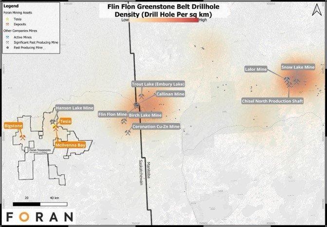 Abbildung 1 – Cluster von VHMS-Lagerstätten im Grünsteingürtel von Flin Flon, die die vergleichsweise geringe Bohrdichte der wenig erkundeten Grundstücke von Foran zeigen.