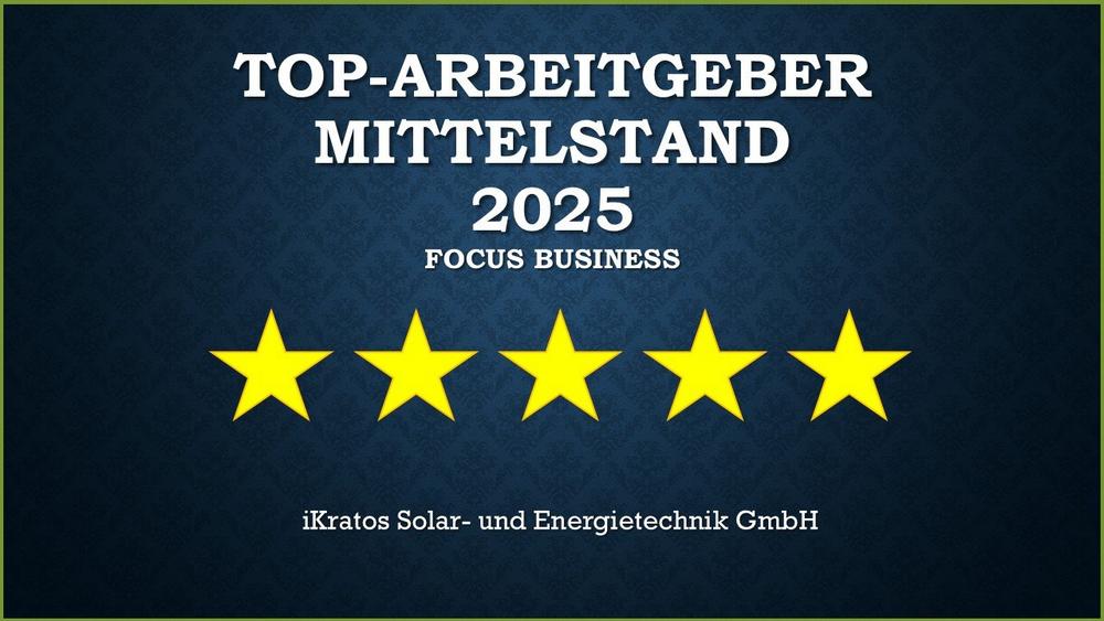 In enger Zusammenarbeit mit dem Recherchepartner FactField GmbH wurde die Auswahl der Top-Arbeitgeber Mittelstand 2025 durchgeführt. Für die Empfehlungsliste waren eine Befragung von Mitarbeitenden und ergänzende Online-Recherche von Mitarbeiterbewertungen auf verschiedenen Portalen die Grundlage. Über den Erhalt der Auszeichnung „Top-Arbeitgeber Mittelstand 2025“ ist iKratos Solar- und Energietechnik stolz.