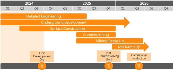 Das Projekt liegt weiterhin im Zeitplan für den Beginn der Heißinbetriebnahme im ersten Halbjahr 2025 und der kommerziellen Produktion im ersten Halbjahr 2026. Zu den wichtigsten kritischen Aktivitäten des Projekts gehören die Installation des primären Baustahls und der Verkleidung der Aufbereitungsanlage, die Installation der SAG-Mühle und der Kugelmühle, die Installation der Kupfer- und Zinkflotationskreisläufe sowie die Inbetriebnahme und der Hochlauf der kommerziellen Produktion.