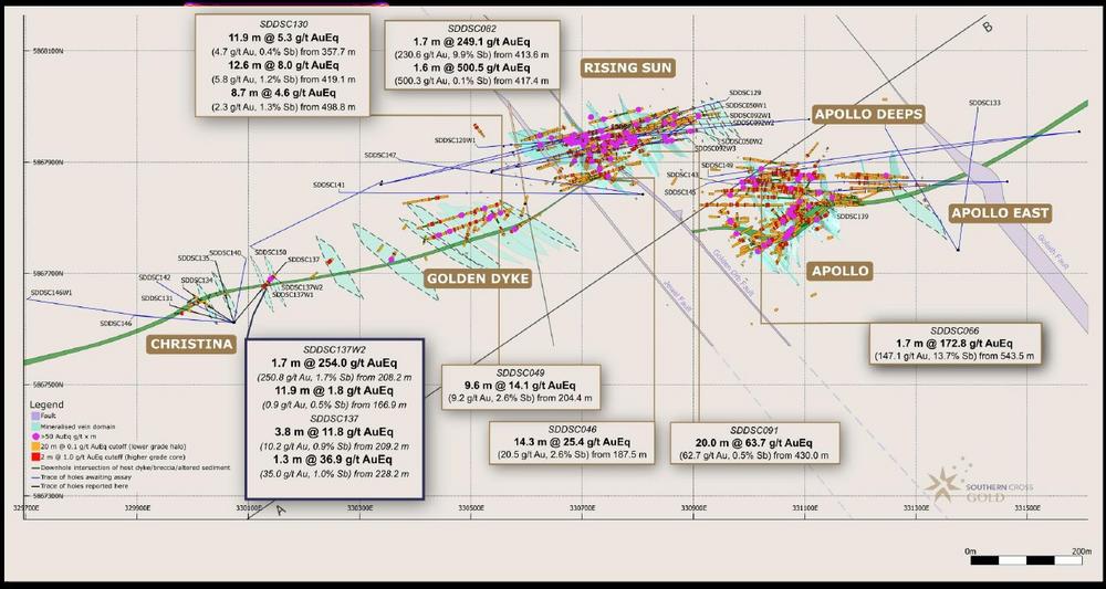 Am 23. Januar 2024 meldete SXG das erste Gold- und Antimon-Explorationsziel auf seinem zu 100 % unternehmenseigenen Projekt Sunday Creek in Victoria, Australien. Die gemeldeten Explorationszielbereiche sind in Tabelle 1 dargestellt. Das Explorationsziel wurde auf die aktuellen Bohrungen bei Apollo und Rising Sun beschränkt, da diese genügend Bohrungen enthalten, um die Kontinuität zu bestimmen und auf die Gehaltsbereiche zu schließen. Dies entspricht etwa einem Drittel bis zur Hälfte des Streichens des Hauptbohrgebiets, und es besteht ein beträchtliches Potenzial, die Größe des Explorationsziels mit hochgradigen Bohrergebnissen, die bis zu 450 m über das Explorationszielgebiet hinaus gebohrt wurden, zu erweitern. Die Bohrungen seit Januar haben den Fußabdruck der Mineralisierung über die Grenzen des Explorationszielgebiets hinaus erheblich erweitert, insbesondere einschließlich SDDSC130, das in dieser Pressemitteilung gemeldet wird (Abbildung 2).