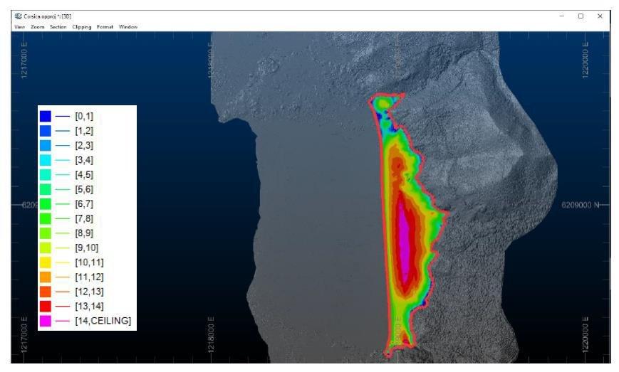 Die heutige Mächtigkeit der Nonza- und Albo-Strandablagerungen wurde durch den Vergleich aktueller topografischer und bathymetrischer LiDAR-Vermessungsdaten der Strandbereiche mit einer rekonstruierten Vorablagerungs-Vermessung geschätzt, die aus historischen Luftaufnahmen und Kartierungen abgeleitet wurde. Aus den historischen und aktuellen Vermessungsdaten wurden Drahtgitter konstruiert, und die heutige Mächtigkeit der Strandablagerungen wurde durch Bestimmung der vertikalen Mächtigkeit zwischen den Drahtgittern geschätzt (Abbildungen 1 und 2).