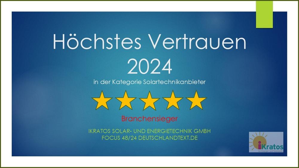 Die iKratos Solar- und Energietechnik GmbH wurde von Focus Money und Deutschland Test mit dem Siegel „Höchstes Vertrauen 2024“ ausgezeichnet. Diese Auszeichnung basiert auf einer umfassenden Analyse von Kundenbewertungen und -meinungen und unterstreicht das hohe Ansehen, das iKratos in der Solarbranche genießt.