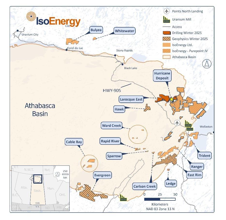 Dan Brisbin, Vice President of Exploration, sagte: "Wir freuen uns darauf, unser Winterexplorationsprogramm zu starten, das die Erprobung von Lagerstättenerweiterungszielen an den Rändern der Lagerstätte Hurricane und die Exploration neuer Lagerstätten entlang des äußerst aussichtsreichen Larocque-Trends umfasst. Die Ziele auf diesem Korridor wurden durch eine umfassende Integration der Geologie der Bohrlöcher, der Geochemie, der Mineralogie der Alteration und der geophysikalischen Daten, einschließlich elektromagnetischer, DC-Widerstands- und ANT-Vermessungen, identifiziert. Der Ansatz basiert auf der Erkenntnis, dass die Uranlagerstätten in Athabasca oft aus mehreren Zonen bestehen, die entlang kilometerlanger Trends verteilt sind, was das Potenzial für zusätzliche Entdeckungen über die Lagerstätte Hurricane hinaus nahelegt. Die Bohrungen in den östlichsten Zielgebieten des Projekts Larocque East werden auch unser Verständnis von günstigen strukturellen Trends verbessern, die sich auf das östlich gelegene Projekt Turnor Lake erstrecken, wo unser Joint-Venture-Partner Purepoint Uranium Pläne für zukünftige Bohrungen vorantreibt."