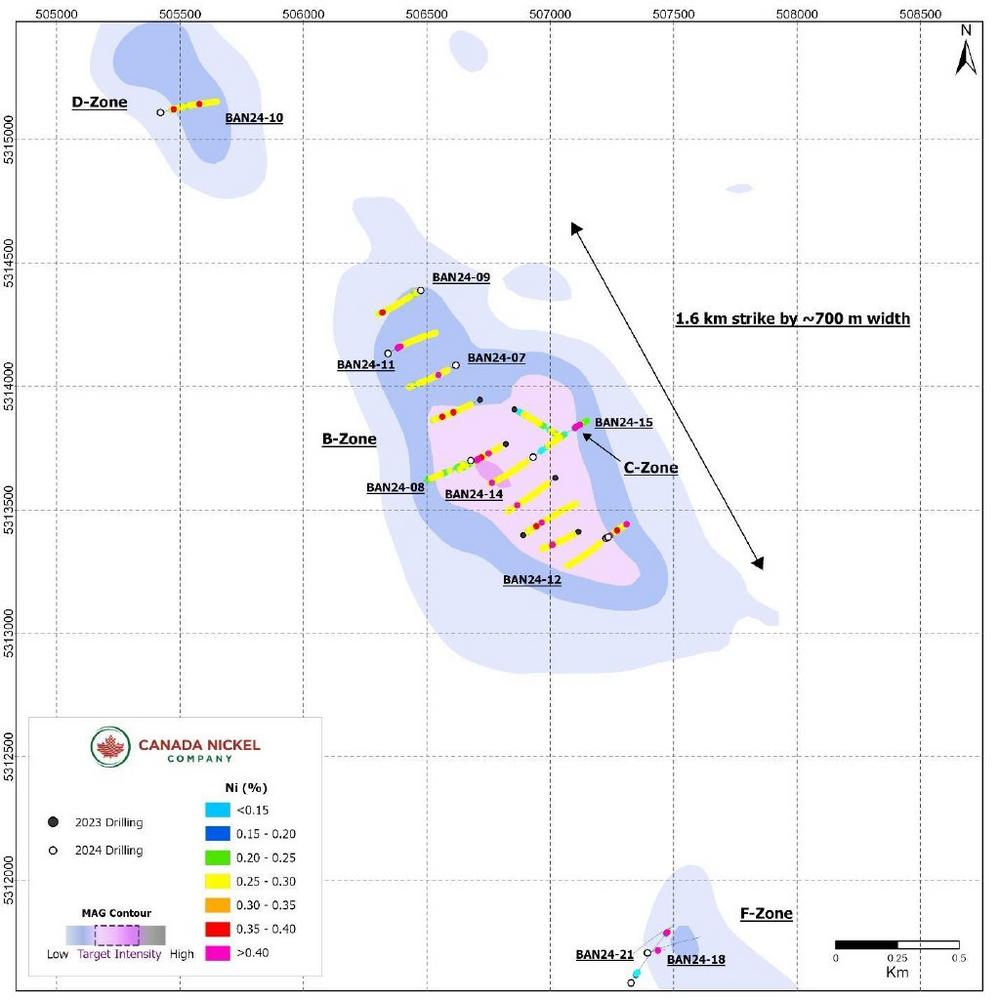 Canada Nickel hat auch andere aussichtsreiche Ziele weiterverfolgt, die auf höhergradiges Material getestet wurden. In der Vergangenheit wurden bei Bannockburn hochgradigere Abschnitte innerhalb der C-Zone und der F-Zone gebohrt. Das Unternehmen plant, im Anschluss an die positiven Ergebnisse und die viel versprechenden geophysikalischen Bohrlochuntersuchungen der Bohrlöcher BAN24-18 und BAN24-21, die F-Zone mit einem Sommerprogramm anzupeilen. Siehe Pressemitteilungen vom 11. November und 5. Dezember 2024 für diese Ergebnisse.