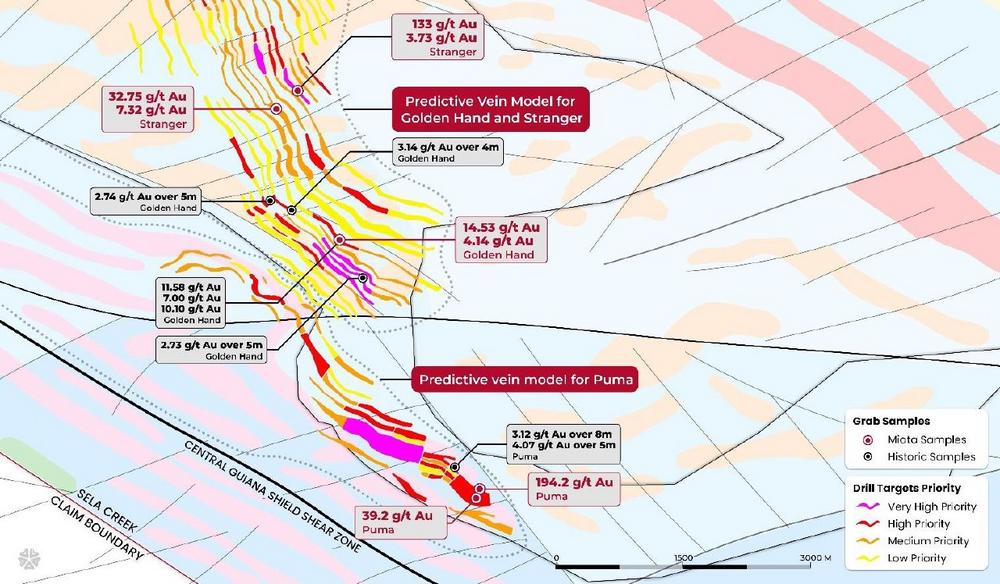 Das Ziel Puma im südöstlichen Teil von Sela Creek ist durch eine intensive hydrothermale Alteration und sich wiederholende Adersätze in einer Vielzahl von metasedimentären und metavulkanischen Gesteinen gekennzeichnet. Das Zielgebiet Puma wurde noch nie bebohrt, wurde jedoch in den letzten zehn Jahren von handwerklichen Bergleuten aktiv abgebaut*. Eine vor Ort entnommene Schürfprobe* aus einer der quer verlaufenden Spannungsadern bei Puma ergab 194,2 g/t Au (mit einer Wiederholungsanalyse von 184,7 g/t Au), nur 30 Meter von einer subparallelen Spannungsader entfernt, die 2024 39,2 g/t Au ergab. Beide Schürfproben* liegen entlang eines 500 Meter langen nordwestlichen Trends mit historischen Schlitzproben*, die 3,12 g/t Au auf 8 Metern und 4,07 g/t Au auf 5 Metern ergaben und als Teil eines einzigen Trends betrachtet werden. Diese Probe wurde in der Pressemeldung des Unternehmens vom 5. Februar 2025 hervorgehoben. Weitere Probenahmen auf dem Ziel Puma werden derzeit im Vorfeld der Bohrungen durchgeführt.