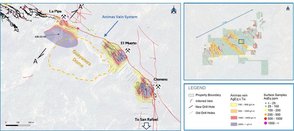 Das Adersystem Animas befindet sich etwa sechs Kilometer nordöstlich des Ressourcengebiets Copala und liegt auf einer reaktivierten nordwestlich bis westlich-nordwestlich verlaufenden normalen Verwerfung, die nach Südwesten einfällt. Das Animas-System beherbergt die größte Anzahl an historischen Bauten, einschließlich der Adern Rosarito und Cuevillas mit einer aktuellen abgeleiteten Ressource von 7,01 Moz AgEq (siehe Pressemitteilung vom 6. Januar 2025). Animas hat eine kartierte Streichlänge von über 7,2 km und erstreckt sich von der Mine San Carlos im Südosten bis zur Claim-Grenze im Nordwesten. Bis heute wurden entlang dieses Korridors zehn mineralisierte Hauptschächte bis zum heutigen Grundwasserspiegel abgebaut, wobei die ältesten bekannten Abbaustätten bis in die 1500er Jahre zurückreichen. Historische Referenzen weisen darauf hin, dass sich der Korridor im Südosten über die Mine San Carlos hinaus erstreckt. Vorläufige Interpretationen der Geologen von Vizsla, die LiDar- und Satellitenbilder verwenden, deuten darauf hin, dass sich der strukturelle Animas-Trend weiter südlich in das vor kurzem erworbene Grundstück San Enrique erstreckt (siehe Pressemitteilung vom 16. April 2024).