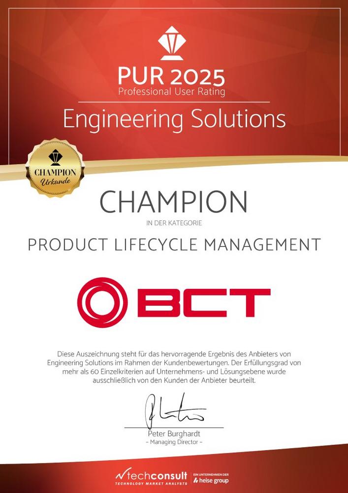 Die Bewertung durch mehr als 3.800 Anwendungsexpert:innen erfolgte auf Grundlage von rund 60 Kriterien in 14 Unterkategorien, darunter Funktionsumfang, Service, Support, Innovationen und Nachhaltigkeit. Insgesamt wurden 16 Anbieter im Bereich PLM-Software in den PUR-Diamanten aufgenommen. BCT Technology nimmt in der höchsten Kategorie „Champion“ erneut die Spitzenposition ein – sowohl im Company Rating als auch im Solution Rating.
