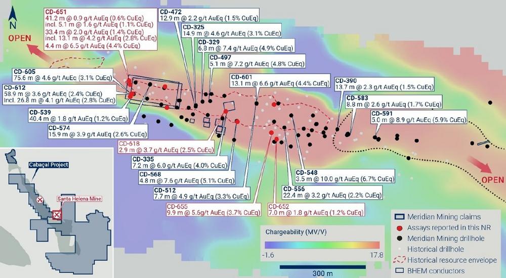 Herr Gilbert Clark, CEO, kommentiert: "CD-651 ergab mehrere oberflächennahe Schichten mit massiven bis halbmassiven und disseminierten Sulfiden, die hochgradige Au-Cu-Ag- und Zn-Mineralisierungen beherbergen, die nur 26 m unter der Oberfläche beginnen. Mit den starken Sulfiden von CD-651 ähnelt das gesamte Santa-Helena-System nun einer Perlenkette aus Edel- und Basismetallen, genau wie die Black-Smoker, die VMS-Lagerstätten bilden. Die Mineralisierung an beiden Enden von Santa Helena ist nach wie vor für Erweiterungen offen, und es sind weitere Bohrungen erforderlich, um dieses System abzuschließen und aufzufüllen. Ich bin der Meinung, dass durch die Kombination dieses Wachstums bei Santa Helena mit der aufregenden Entdeckung Santa Fé das Potenzial für einen zukünftigen zweiten Minen-Hub, der sich auf Santa Helena konzentriert, offensichtlich ist. Dieses Wachstumspotenzial baut auf den außergewöhnlichen PFS-Ergebnissen für Cabaçal1 auf, weshalb das Cabaçal-Projekt von Meridian der aussichtsreichste Cu-Au-VMS-Gürtel Brasiliens und Südamerikas ist."