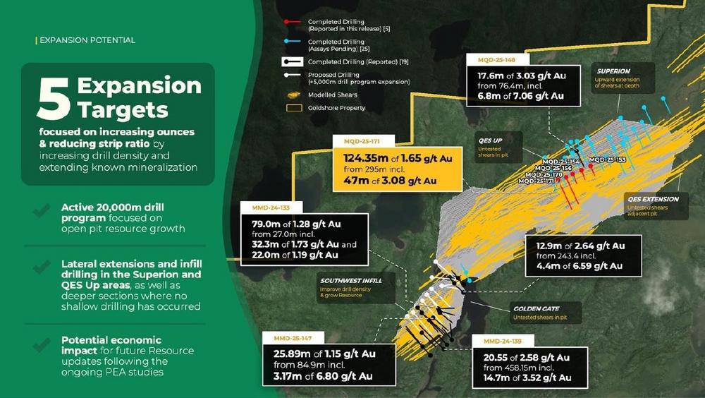 - Die Ergebnisse von zwei Bohrlöchern, mit denen bedeutende Bohrlücken in der Zone QES geschlossen wurden, durchschnitten weite Abschnitte mit goldmineralisierten Kernscharen, einschließlich des höchstgradigen x Mächtigkeit-Abschnitts, der jemals von Goldshore gemeldet wurde. Die Ergebnisse bestätigen das Vorhandensein einer oberflächennahen, hochgradigen Goldmineralisierung innerhalb der Kernscherungen und zeigen das Potenzial für die Entdeckung zusätzlicher tiefliegender Ausläufer. Darüber hinaus übertrafen die Ergebnisse von MQD-25-171 die auf der aktuellen Mineralressourcenschätzung (MRE) basierenden Gehaltserwartungen mit besten Abschnitten von: