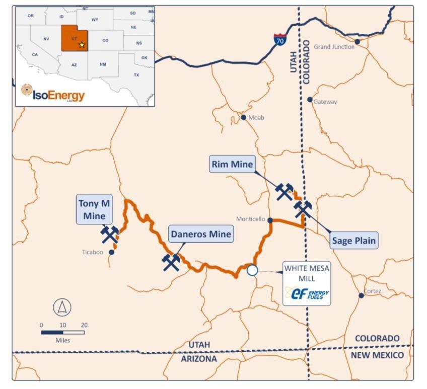 Abbildung 1: Lage der drei ehemals produzierenden Minen von IsoEnergy in Utah, die strategisch in der Nähe der voll funktionsfähigen White Mesa Mühle liegen, für die IsoEnergy einen Vertrag mit Energy Fuels über eine Mühlengebühr abgeschlossen hat. White Mesa ist die einzige vollständig lizenzierte und in Betrieb befindliche konventionelle Uranmühle in den Vereinigten Staaten mit einer lizenzierten Kapazität von über 8 Millionen Pfund U₃O₈ pro Jahr und spielt eine wichtige Rolle in der US-Kernbrennstoffversorgungskette.