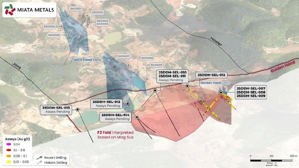 Wir freuen uns, die Ergebnisse unserer ersten neun Bohrlöcher bekannt zu geben, die die ersten 1.447 m unseres 10.000 m umfassenden Bohrprogramms ausmachen", sagte Dr. Jacob Verbaas, CEO von Miata. "Unsere Ergebnisse beinhalten mehrere oberflächennahe Abschnitte mit goldhaltigen Strukturen im Grundgestein, wie etwa 7,5 m mit 1,05 g/t Au aus 13,5 m und 2 m mit 4,72 g/t Au ab 19,3 m. Dieses Gebiet stellt nun ein überzeugendes Tagebauziel dar. Wir nutzen diese wertvollen Daten weiterhin, um uns auf den Kern des Ziels Golden Hand zu konzentrieren, wo bereits vier Löcher gebohrt wurden, deren Ergebnisse noch ausstehen. Wir freuen uns auf die Ergebnisse der weiteren Bohrungen und die Ausweitung der Bohrungen auf die sechs anderen hochprioritären Ziele bei Sela Creek."