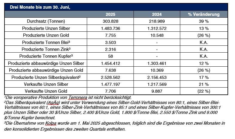 - Metallverkäufe und Lagerbestände: Im zweiten Quartal wurden 1.477.197 Unzen Silber und 7.706 Unzen Gold verkauft. Zum 30. Juni 2025 umfassten die Lagerbestände insgesamt 242.980 Unzen Silber und 701 Unzen Gold in Barrenform sowie 24.970 Unzen Silber und 399 Unzen Gold in Konzentratform.