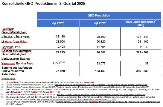 Die konsolidierte GEO-Produktion für die ersten sechs Monate des Jahres 2025, einschließlich der Yaramoko-Mine, belief sich auf insgesamt 179.409 Unzen, einschließlich der Gutschriften für Blei- und Zink-Nebenprodukte. Fortuna bekräftigt seine aktualisierte Jahresproduktionsprognose für 2025 im Bereich von 309.000 bis 339.000 GEO. Alle Zahlen in dieser Pressemitteilung sind, sofern nicht anders angegeben, in US-Dollar angegeben.