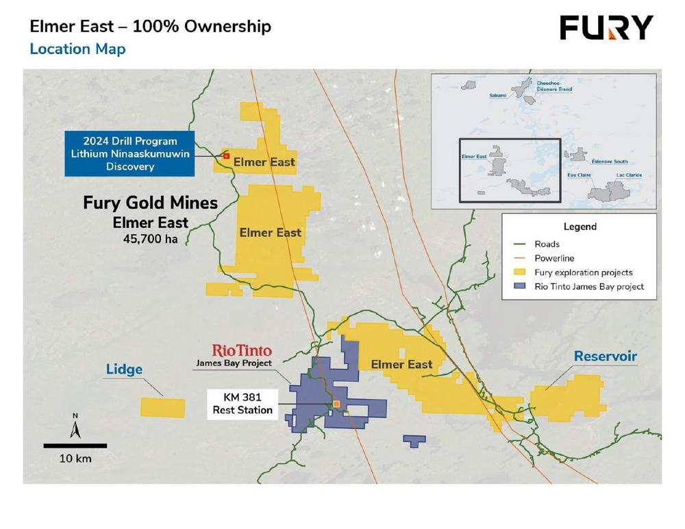 Die Lithiumentdeckung Ninaaskumuwin befindet sich auf dem zu 100 % im Besitz von Fury befindlichen Projekt Elmer East, das sich über etwa 45.735 Hektar (ha) erstreckt. Ninaaskumuwin ist vom asphaltierten Billy Diamond Highway aus leicht zu erreichen, etwa 60 Kilometer (km) nördlich des Rastplatzes „km 381“, wo Unterkünfte, Verpflegung, Kraftstoff und Strom zur Verfügung stehen (Abbildung 1). Die Entdeckung liegt etwa 50 km nördlich des Lithiumprojekts Galaxy von Rio Tinto plc, das im März 2025 im Rahmen der Übernahme von Arcadium Lithium plc für 6,7 Milliarden USD erworben wurde.