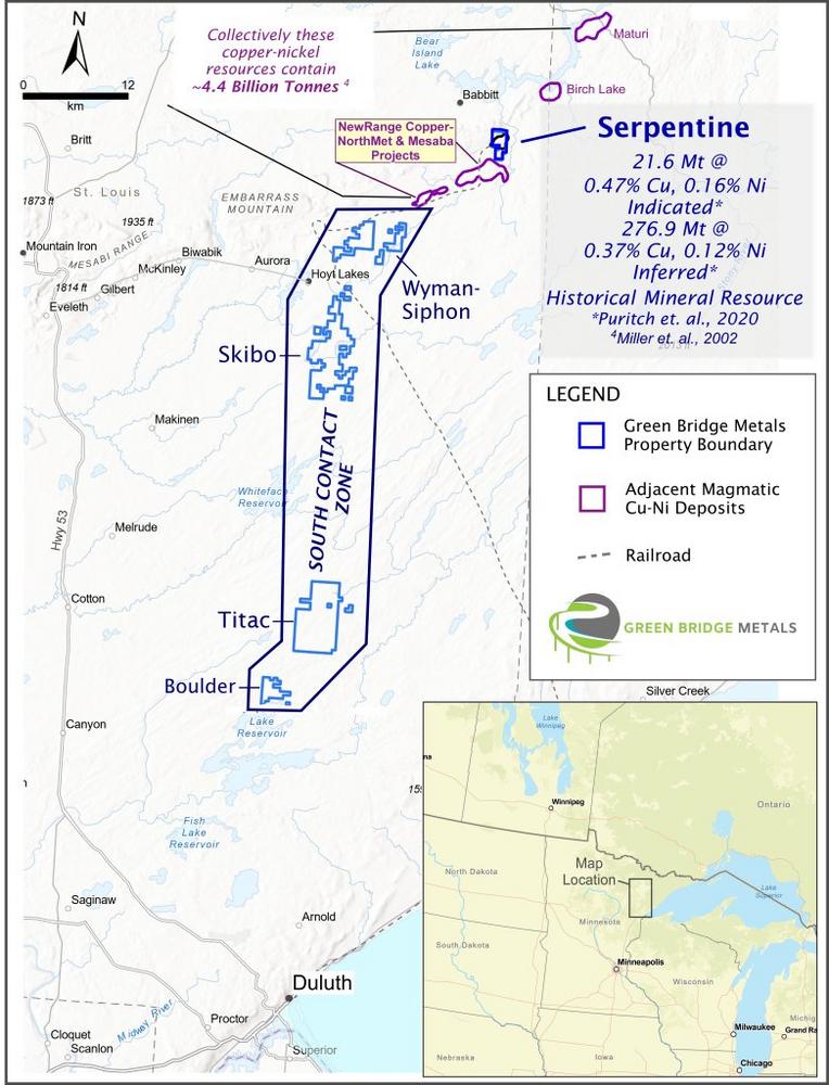 Green Bridge Metals Corporation ist ein in Kanada ansässiges Explorationsunternehmen, das sich auf den Erwerb von Vorkommen mit „kritischen Mineralien“ und die Erschließung der South Contact Zone (das „Grundstück“) entlang des Basalkontakts des Duluth-Komplexes nördlich von Duluth (Minnesota) konzentriert. Die South Contact Zone enthält Kupfer-Nickel- und Titan-Vanadium-Vorkommen in großen Mengen in Ilmenit, das in ultramafischen bis oxidierten ultramafischen Intrusionen vorkommt. Das Grundstück verfügt über Explorationsziele für Ni-Mineralisierungen in großen Mengen, hochgradige Ni-Cu-PGE-Magmasulfid-Mineralisierungen und Titan.