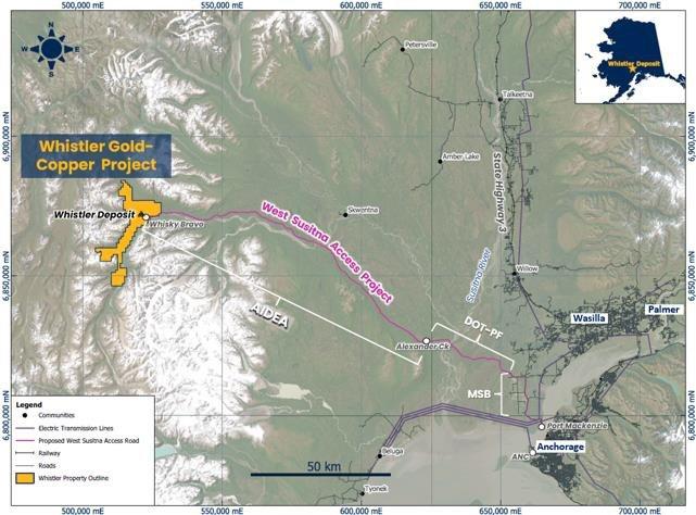 Am 25. Juli 2025 gab AIDEA bekannt (hier), dass sie beim Department of the Army („DA“) einen Antrag auf eine Einzelgenehmigung für den Bau des WSAP gestellt hat, einer 78,5 Meilen langen Zufahrtsstraße durch den Matanuska-Susitna Borough („MSB“) im Süden von Zentralalaska. Die WSAP wird Whistler mit der bestehenden Autobahn-, Eisenbahn-, Strom- und Hafeninfrastruktur im östlichen MSB verbinden, wo in den drei Städten Anchorage, Palmer und Wasilla zahlreiche qualifizierte Arbeitskräfte leben. Die WSAP wird ganzjährig öffentlichen Zugang zu derzeit abgelegenen staatlichen und privaten Grundstücken innerhalb des MSB sowie zu Gebieten ermöglichen, die für die Ressourcenerschließung vorgesehen sind, darunter das Whistler-Projekt. Der WSAP beginnt etwa 1,4 Meilen westlich von Alexander Creek und erstreckt sich bis zur Whiskey Bravo-Landebahn und den Mineralienexplorationskonzessionen und dem Lagerplatz des Unternehmens in Whistler, wo er etwa 2 Meilen von der Flaggschiff-Gold-Kupfer-Lagerstätte des Projekts endet.