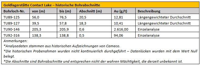 Contact Lake kann auf eine lange Geschichte der Goldexploration zurückblicken, ist jedoch weitgehend noch nicht ausreichend anhand moderner Verfahren erkundet worden. Der Goldgürtel La Ronge ist Standort mehrerer ehemals aktiver Minen und ausgebauter Goldlagerstätten und nach Ansicht des Managements könnte sich Contact Lake zu einem grundlegenden Asset mit bezirksweiten Wachstumsmöglichkeiten entwickeln.
