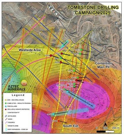 Aztec Minerals Corp. (AZT: TSX-V, OTCQB: AZZTF) („Aztec“ oder das „Unternehmen“) gibt bekannt, dass es die Ergebnisse des zweiten, fünf Bohrlöcher umfassenden Reverse-Circulation-Teils des Bohrprogramms 2025 im Konzessionsgebiet Tombstone im Südosten von Arizona erhalten hat.  Im Rahmen des Bohrprogramms 2025 wurden nun 19 RC-Bohrlöcher abgeschlossen, wobei die Ergebnisse von weiteren fünf Bohrlöchern hiermit bekannt gegeben werden. Die visuellen Beobachtungen der gebohrten Probenmaterialien und die Analyseergebnisse bestätigen weiterhin das geologische Explorationsmodell von Aztec. Infolgedessen kam das JV-Managementkomitee des Konzessionsgebiets Tombstone vergangene Woche zusammen und genehmigte eine Erweiterung des Bohrprogramms von den ursprünglich geplanten 5.000 Metern auf 7.500 Meter, wobei es voraussichtlich bis zum Ende des vierten Quartals 2025 verlängert werden wird.