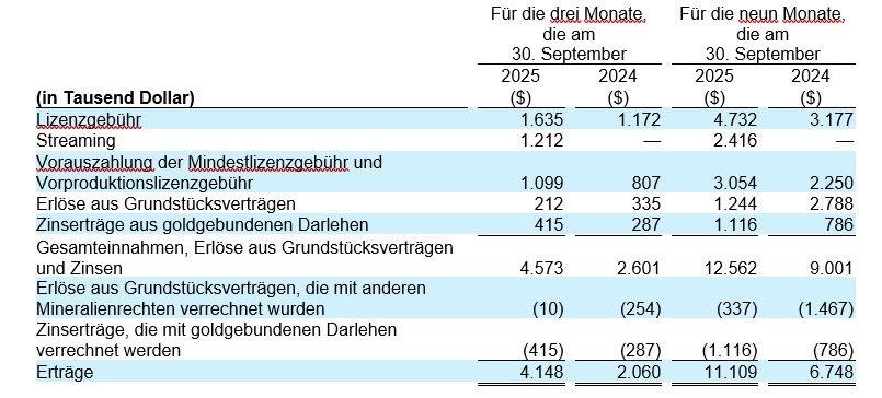 Der Gesamtumsatz, die Erlöse aus Grundstücksverträgen und Zinsen werden ermittelt, indem die Erlöse aus Grundstücksverträgen, die anderen Mineralienanteilen gutgeschrieben werden, und die Zinsen aus goldgebundenen Darlehen zum Gesamtumsatz hinzugerechnet werden. Wir haben diese Informationen aufgenommen, da das Management davon ausgeht, dass bestimmte Anleger diese Informationen verwenden, um unsere Leistung im Vergleich zu anderen Gold-Royalty-Unternehmen in der Edelmetallindustrie zu bewerten.