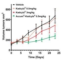 In der vergleichenden In-vivo-Studie zeigte Accum®-Kadcyla eine etwa 20-fach höhere tumorhemmende Wirksamkeit als Kadcyla® allein, wenn es in derselben Dosis (0,5 mg/kg) verabreicht wurde. Das Tumorwachstum wurde in der mit Accum®-Kadcyla behandelten Gruppe signifikant gestoppt, was bei den meisten Mäusen zu einer anhaltenden und nahezu vollständigen Tumorrückbildung führte, während Kadcyla® in der gleichen Dosis (0,5 mg/kg) keine Wirkung zeigte. Bemerkenswerterweise überlebten 100 % der Tiere die gesamte Studiendauer ohne Anzeichen von Toxizität, was die hervorragende Verträglichkeit der Behandlung unterstreicht (siehe Abbildung unten).