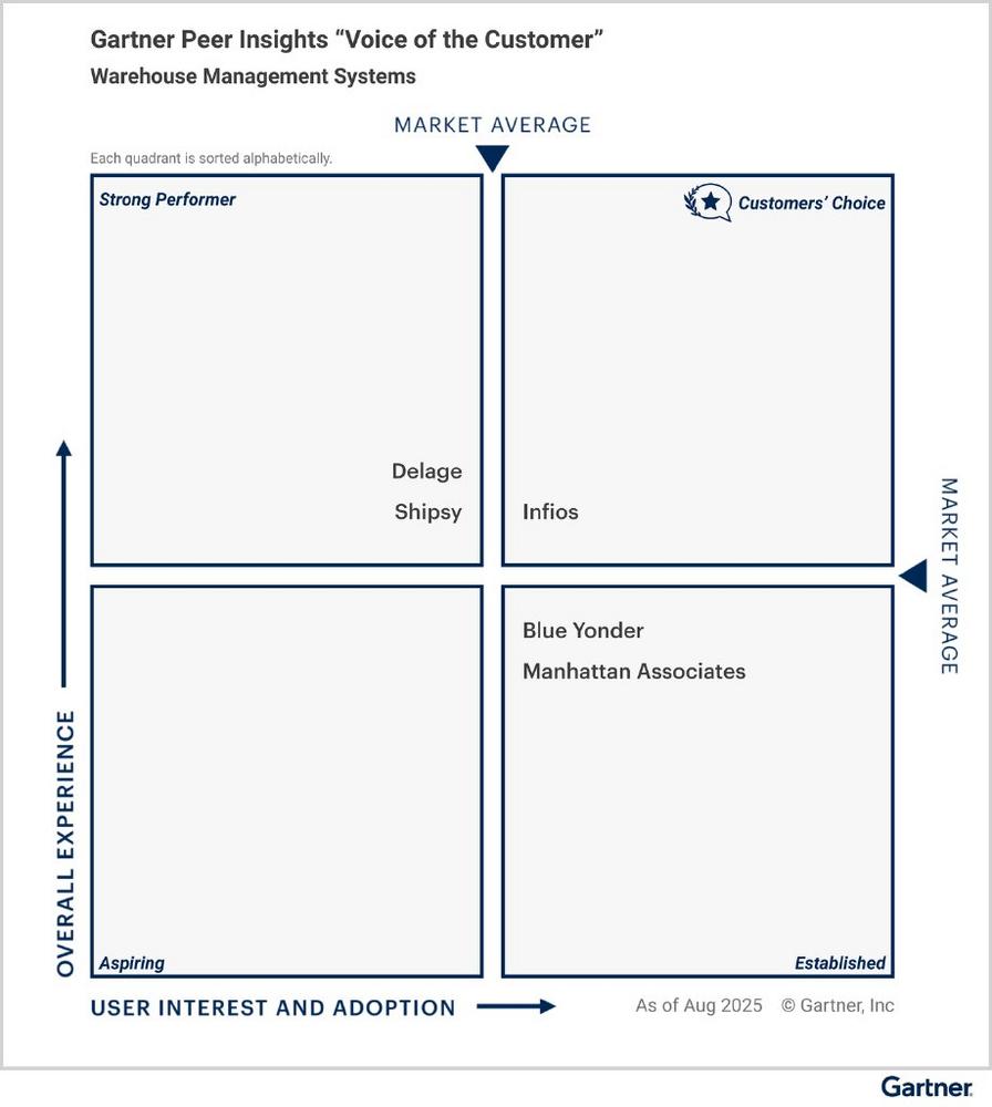 Mit einer durchschnittlichen Bewertung von 4,5 von 5 Punkten auf Basis von 32 verifizierten Kundenrezensionen (Stand: 31. August 2025) erreichte Infios die Platzierung im oberen rechten Quadranten des Reports – der Kategorie Customers’ Choice. Infios erhielt diese Auszeichnung bereits im Jahr 2023, damals noch unter dem Namen Körber Supply Chain Software.