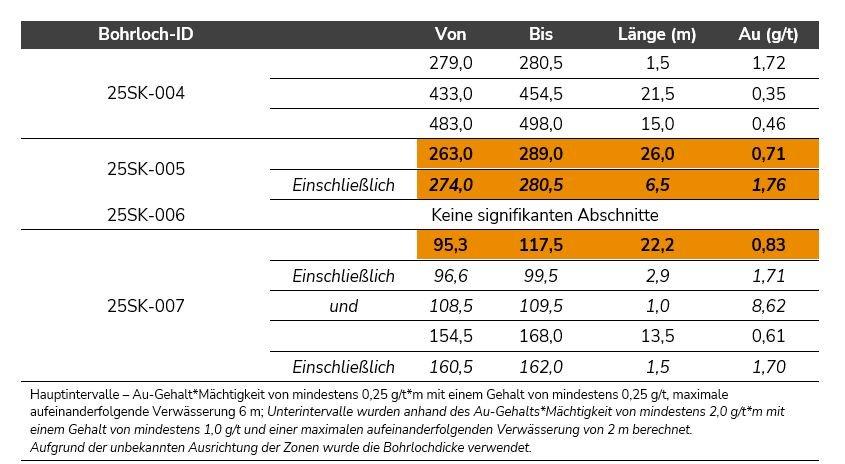 • 26,0 m mit 0,71 g/t Gold, einschließlich 6,5 m mit 1,76 g/t Gold in Bohrloch 25SK-005;*