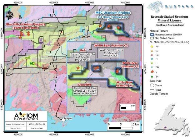 Im Rahmen dieser Expansion hat Mustang seine Registrierung außerhalb der Provinz abgeschlossen und ist nun berechtigt, in Neufundland und Labrador geschäftlich tätig zu sein. Der Eintritt des Unternehmens in diese vielversprechende und bergbaufreundliche Provinz unterstreicht sein Engagement, neue Uran- und kritische Mineralvorkommen in ganz Kanada zu identifizieren und zu erschließen.