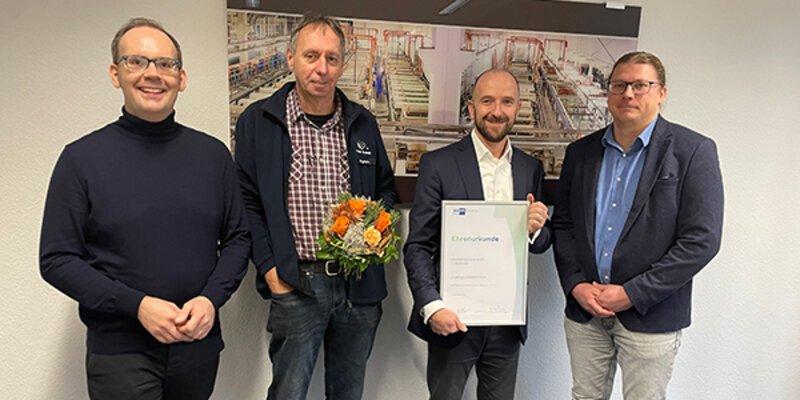 Die Geschäftsleitung und der Produktionsleiter der SAXONIA Galvanik GmbH wurden Anfang Dezember 2025 von der IHK Chemnitz, vertreten durch Cornell Zerbe von der Regionalkammer Mittelsachsen, mit der IHK-Ehrenurkunde und einem Blumenstrauß überrascht.