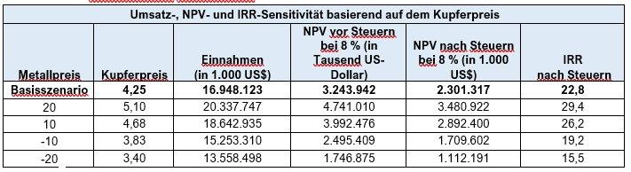 • Projektwirtschaftlichkeit nach Steuern bei 4,25 USD/lb Kupfer:
