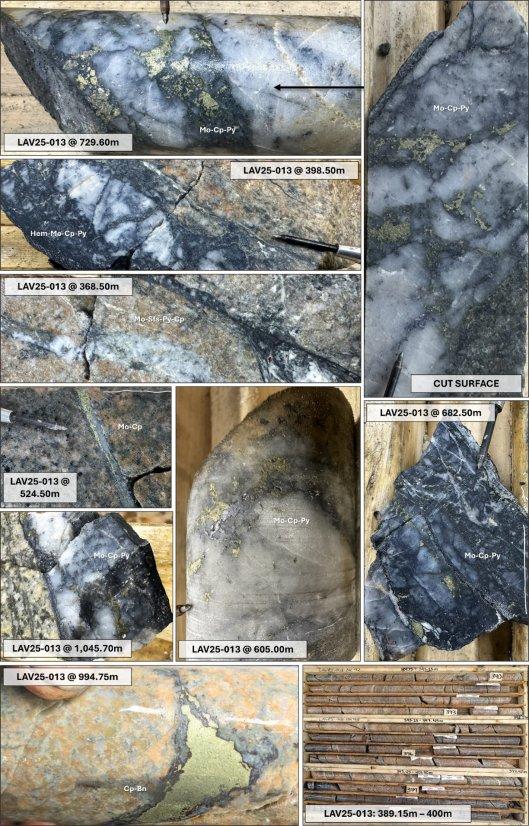 Das Bohrloch LAV25-013 wurde 280 Meter nordwestlich der Bohrlöcher LAV25-011 und 010 in einer intensiv durch Hämatit±Biotit±Magnetit alterierten Phase des Porphyrsystems Laverdiere angesetzt. Diese Zone weist eine hohe Dichte epithermaler Gänge sowie von Molybdänit-Pyrit dominierten Porphyrgängen auf, die bis zu einer Bohrtiefe von ca. 515 Metern anhalten. In ungefähr 350 Metern Tiefe steigt der Chalkopyritgehalt in den Porphyrgängen mit fleckigem Bornit innerhalb schmaler, gut entwickelter Zonen von unterschiedlich alteriertem Porphyr. Diese mineralisierten Zonen wurden mit Unterbrechungen bis zu Bohrtiefen von über 1.050 Metern, im Wechsel mit Zonen von spät- bis postmineralischem Porphyr bebohrt.