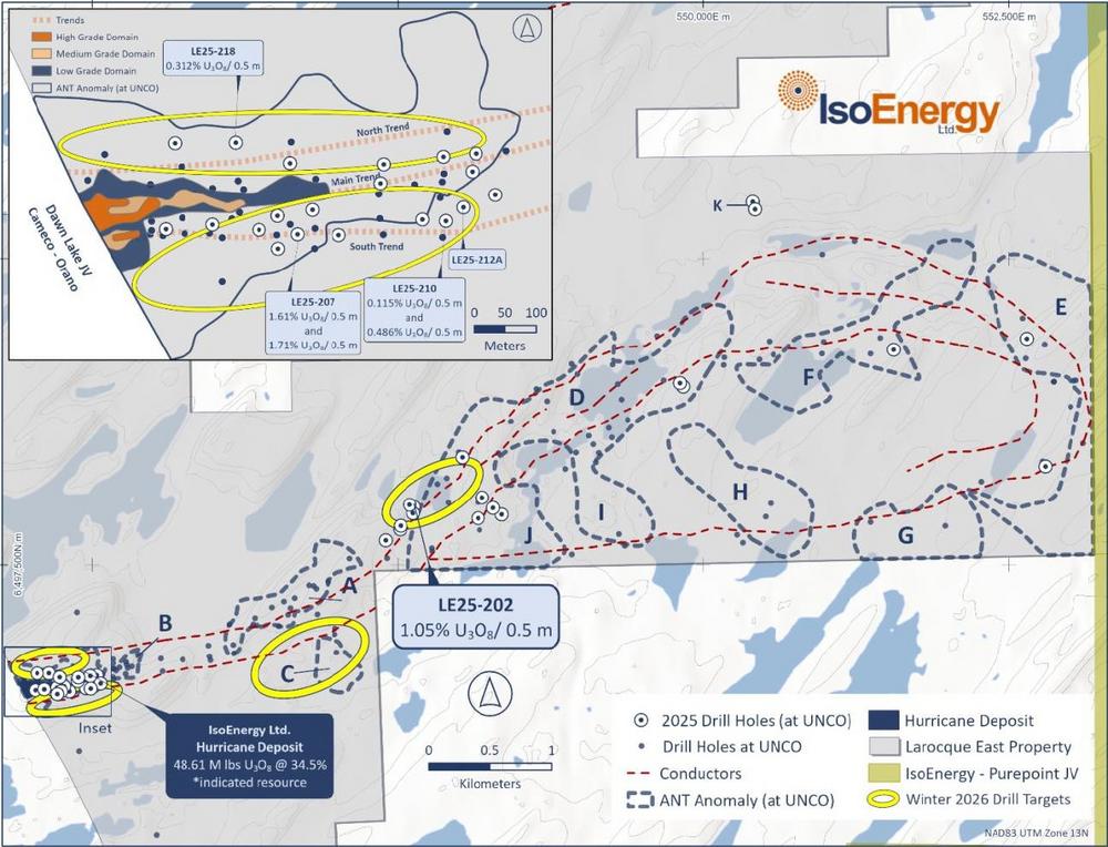 IsoEnergy Ltd. („IsoEnergy” oder das „Unternehmen”) (NYSE American: ISOU; TSX: ISO) (- https://www.commodity-tv.com/… -) freut sich, den Beginn seines Winterexplorationsprogramms 2026 im Larocque East-Projekt (das „Projekt“) bekannt zu geben, das die hochgradige Lagerstätte Hurricane im östlichen Athabasca-Becken in Kanada beherbergt. Das Programm umfasst Diamantbohrungen mit einer Gesamtlänge von etwa 5.200 m und bis zu 13 Bohrlöchern, die auf die Erweiterung der Ressourcen in der Lagerstätte Hurricane sowie auf Greenfield-Ziele abzielen, die sich bis zu drei Kilometer östlich entlang des Trends erstrecken (Abbildung 1).