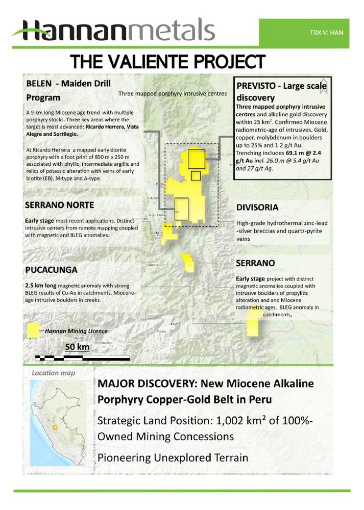 Im Laufe des Jahres 2021 hat Hannan 1.002 km²an zu 100 % unternehmenseigenen Bergbaukonzessionen in Valiente abgesteckt und hält diese weiterhin. Diese umfassen unerforschtes Gelände mit potenziellen mineralisierten Porphyr-Zielen im zentralen Osten Perus. Das Projekt Valiente hat sich rasch von einem Greenfield-Prospektionsprojekt zu einer Multi-Prospektionsmöglichkeit entwickelt.
