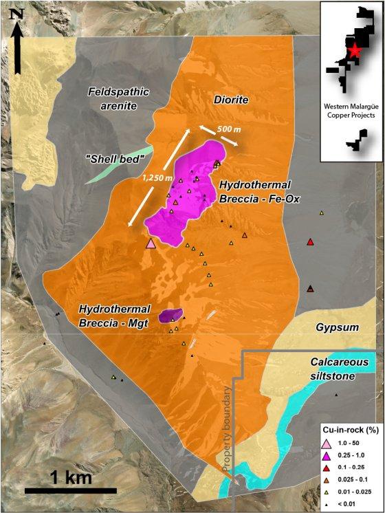 Mehrere weitere kleinere hydrothermale Brekzienkörper innerhalb des Diorit-Intrusionskörpers wurden kartiert, darunter eine 300 m x 150 m große Brekzie mit Magnetitzementation, deren Proben bis zu 223 ppm Kupfer aufweisen (Abbildung 2).