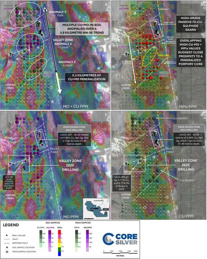 Das Explorationsprogramm 2025 von Core Silver umfasste die Durchführung von systematischen geochemischen Bodenuntersuchungen auf einer Fläche von 1,4 km mal 5,6 km. Insgesamt wurden 231 Bodenproben in Abständen von 200 mal 200 Metern entnommen. Das Programm war darauf ausgerichtet, neue Mineralisierungszonen zu ermitteln und die Gebiete mit bekannter Kupfer- und Molybdänanreicherung in Bereichen mit geringen Ausbissen an der Oberfläche über dem Laverdiere-Porphyr zu erweitern (Abbildung 1).