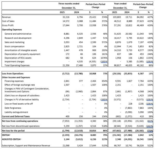 – HEALWELL erzielte im vierten Quartal 2025 einen Quartalsumsatz aus fortlaufenden Betrieben in Höhe von 32,2 Millionen Dollar – eine Steigerung von 374 % gegenüber dem Umsatz von 6,8 Millionen Dollar im vierten Quartal 2024. Die Übernahme von Orion Health sowie beide organischen Wachstumsinitiativen trugen wesentlich zum Gesamtumsatzwachstum bei.