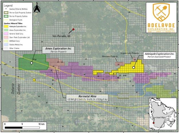 Adelayde Exploration Inc. (das „Unternehmen“ oder „Adelayde“) (ADDY:CSE) (SPMTF:OTCID) (A41AGV:WKN) freut sich bekannt zu geben, dass das Unternehmen derzeit Pläne für Arbeiten auf dem 9.168 Acres großen Goldprojekt Perron-East in Quebec erarbeitet. Perron-East befindet sich in unmittelbarer Nähe von Amex Exploration Inc. (AMX). Am 13. April 2026 veröffentlichte Amex Exploration Inc. eine positive Machbarkeitsstudie für die Erschließung der Goldmine Perron(1). Zu den Höhepunkten der Machbarkeitsstudie von Amex gehören eine Goldproduktion von durchschnittlich 147.000 Unzen pro Jahr in den 5 Jahren der kommerziellen Phase-1-Produktion zu nachhaltigen Gesamtkosten („AISC“) von 910 US$ pro Unze Au, ein prognostizierter interner Zinsfuß (IRR) nach Steuern von 114,6 % und ein Kapitalwert (NPV5) nach Steuern von 1,13 Milliarden C$, der sich aus einem kumulativen nicht diskontierten Cashflow nach Steuern in Höhe von 1,44 Milliarden C$ bei einem angenommenen Goldpreis von 3.500 US$ pro Unze ergibt. Das Management weist darauf hin, dass frühere Ergebnisse oder Entdeckungen auf Konzessionsgebieten in der Nähe von Adelayde nicht zwangsläufig auf das Vorhandensein von Mineralisierungen auf den Konzessionsgebieten des Unternehmens schließen lassen.