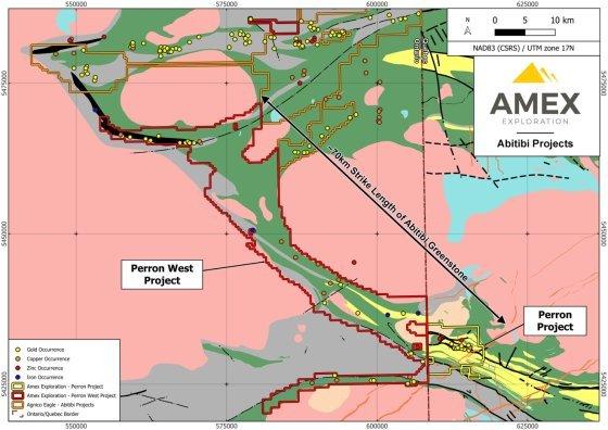 Amex Exploration Inc. hat beim zu 100 % unternehmenseigenen Projekt Perron, das sich etwa 110 Kilometer nördlich von Rouyn-Noranda in Quebec befindet, bedeutende hochgradige Goldvorkommen sowie kupferreiche vulkanogene Massivsulfid- (VMS)-Zonen entdeckt. Das Projekt Perron in Quebec umfasst 183 zusammenhängende Claims mit einer Fläche von 65,72 km² und umfasst mehrere Zonen mit hochgradiger Goldmineralisierung, VMS-Mineralisierung sowie „hybrider“, goldreicher VMS-Mineralisierung.