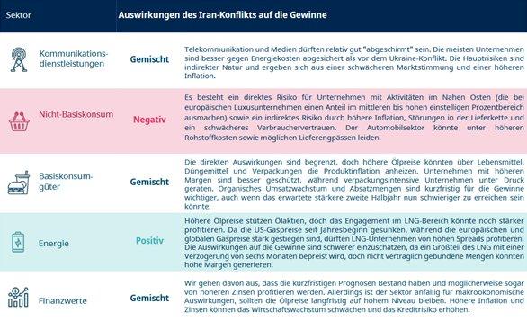 Während der Invasion in die Ukraine 2022 wurde das EPS-Wachstum für viele Sektoren nach oben korrigiert, wobei der Energiesektor hier besonders herausstach. Dies dürfte auch im Falle des Iran-Konflikts wieder der Fall sein. Ebenso könnten die Umsätze des Finanzsektors von dem Umfeld höherer Renditen profitieren, wenngleich dies durch eine mögliche Vorziehung von Kreditrückstellungen gemäß den neuen IFRS-9-Rechnungslegungsvorschriften bei einigen Instituten – vor allem bei britischen und asiatischen Banken, die Engagements in der Nahostregion haben – ausgeglichen werden könnte. Chemieunternehmen wiederum könnten von Versorgungsengpässen profitieren, und Fluggesellschaften sind kurzfristig durch Treibstoff-Hedging-Programme abgesichert, obwohl sie mit einer Verknappung von Flugbenzin konfrontiert sind, sollte die Situation anhalten.