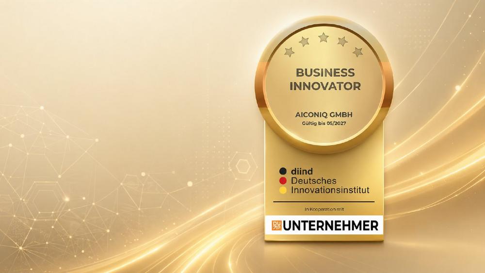 Die Auszeichnung als Business Innovator würdigt genau diesen Ansatz. Das Prüfverfahren bewertet Unternehmen unter anderem nach Innovationskraft, Zukunftsorientierung, digitaler Aufstellung, Website-Performance, Nutzererfahrung sowie der Wahrnehmung durch Mitarbeitende und Kunden. AICONIQ konnte in diesem Verfahren überzeugen und wurde auf Basis eines zweistufigen Prüfprozesses ausgezeichnet. Die Urkunde ist bis einschließlich 05/2027 gültig und auf den 23.04.2026 datiert.