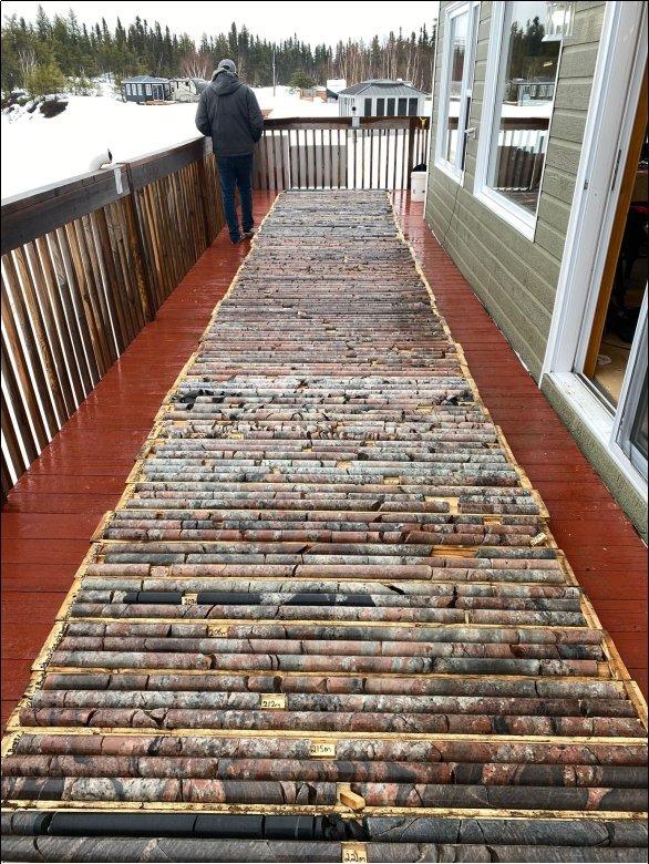 Die durchgängige zentrale Zone, ein 105,45 Meter langes Pegmatitintervall von 63,85 bis 169,3 Metern, ist mit Gammastrahlenspektrometer-Spitzenwerten (von bis zu etwa 1.400 Zählimpulsen pro Sekunde) verbunden, die rauchquarzreiche Abschnitte und titanreiche Magnetitmineralien innerhalb des Hauptpegmatits aufweisen. Ein hellbraunes Mineral, das in direkter Vergesellschaftung mit Magnetit festgestellt wurde, ergab beim portablen RFA-Screening erhöhte Niob-, Yttrium- und Phosphorwerte; die kombinierten Reaktionswerte von Gammastrahlenspektrometer und portabler Röntgenfluoreszenzanalyse werden vom Unternehmen als vielversprechende qualitative Indikatoren für eine potenzielle Niob- und Seltenerdmineralisierung betrachtet. Die Proben wurden an das Labor versandt; die Untersuchungsergebnisse stehen noch aus.